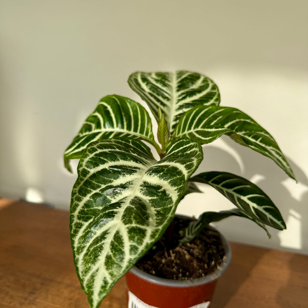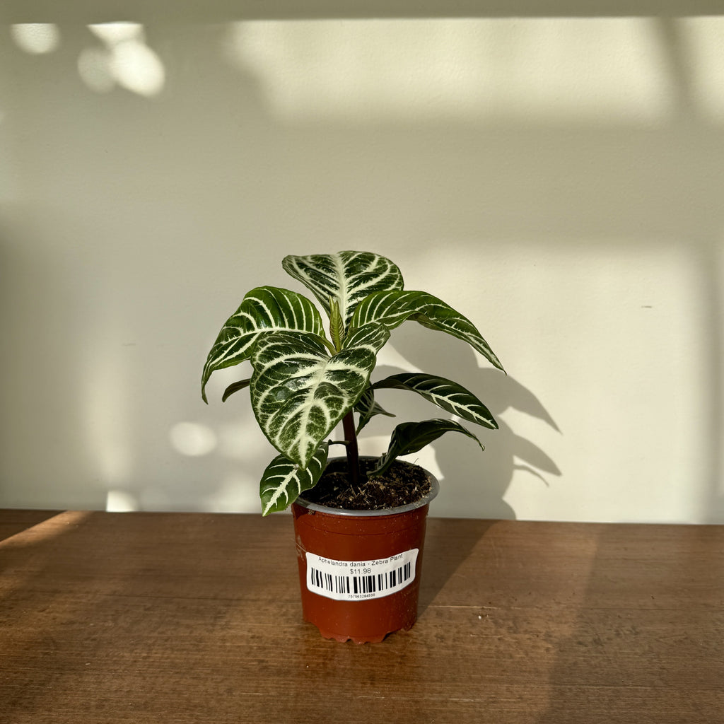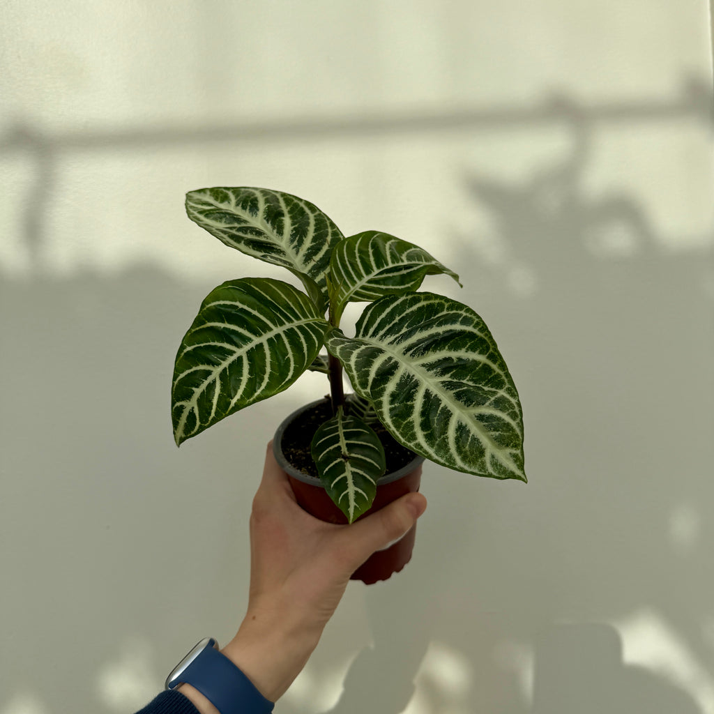 The Zebra Plant is a striking tropical houseplant admired for its bold, glossy green leaves patterned with dramatic white veins. Compact and eye-catching, this plant can also reward attentive care with clusters of bright yellow flower bracts, adding an extra burst of color to its already exotic appearance. In a 4" pot, it’s perfectly sized for desktops, shelves, or as a statement accent in plant groupings.