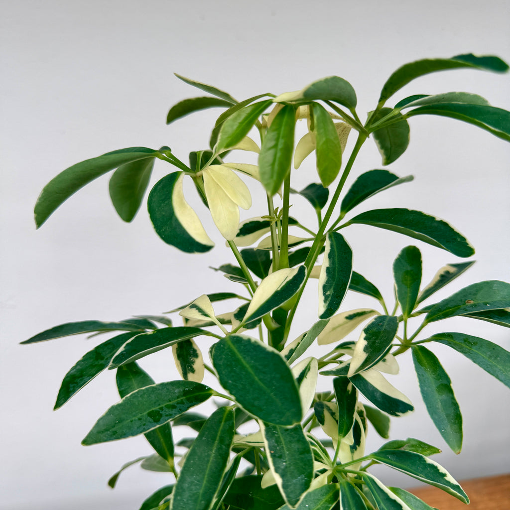 A compact, cheerful houseplant with creamy variegated leaves that fan out like tiny umbrellas—perfect for brightening desks, shelves, and small spaces.